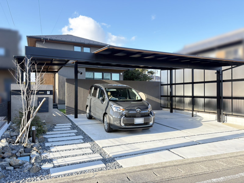 カーポート、植栽、玄関アプローチとトータルで外構を設計~施工した施工事例となります。